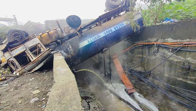 या टँकरमधून २५ टन सल्फ्युरिक ॲसिड हे केमिकल घेऊन जात असताना चालकाचा वाहनावरील ताबा सुटल्याने सदर टँकर मुंब्रा बायपास रोडवरून बाजूला असलेल्या नाल्यामध्ये पलटी झाला. चालकाच्या डाव्या हाताला आणि कमरेला तसेच चेहऱ्याला दुखापत झाली आहे. सदरचा अपघात झाल्याने मुंब्रा- ठाणे रोडवरील वाहतूक धिम्या गतीने सुरू होती. टँकर पलटी झाल्याने या ठिकाणी टँकर मधून केमिकलचा धूर व उग्र वास येत होता.