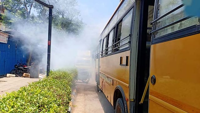 आलिमघरकडून ठाणे रेल्वे स्टेशनला जात असलेली टीएमटी बस क्रमांक एमएच 04 केएफ 4042 या बसच्या स्टार्टरमध्ये शॉर्टसर्किट झाल्याने आग लागली. ही घटना आज (शनिवार) कळव्यातील खारेगाव येथे घडली. मात्र, वेळीच प्रवाशांनी बस बाहेर पडल्याने पुढील अनर्थ टळला. या बस मध्ये 15 प्रवासी प्रवास करीत होते.
