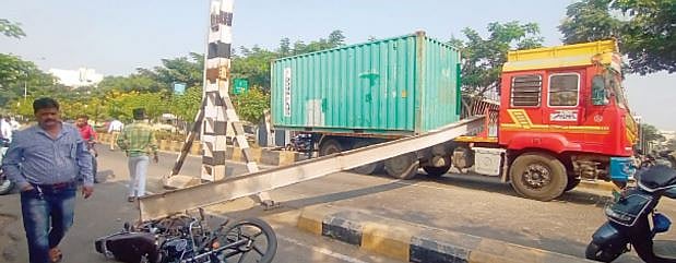 बारामती : पुढारी वृत्तसेवा : बारामतीतील रेल्वे उड्डाणपुलावरून अवजड वाहने ये-जा करू नयेत, या उद्देशाने पालिकेने उभारलेला 'रिस्ट्रिक्टर' (लोखंडी कमान) एका कंटेनरमुळे तुटला. बाजूने जात असलेल्या दुचाकीस्वारावर तो पडला. या अपघातात दुचाकीस्वार जखमी झाला. रेल्वे उड्डाणपुलावरून अवजड वाहनांना ये-जा करण्यास बंदी असतानाही पालिका, वाहतूक पोलिस, आटीओ प्रशासन त्याकडे लक्ष देत नसल्याने, त्यातून ही घटना घडली. बारामती शहरातील उड्डाणपुलावरील अपघातांची मालिका थांबण्याचे नाव घेत नाही. प्रशासनाच्या हलगर्जीपणामुळे वारंवार अपघात होत असून अनेक जण यात गंभीर जखमी तर अनेकांना आपला जीव गमवावा लागला आहे.