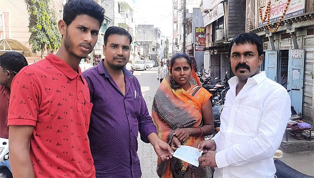 पिंपळनेर : पिडीत कुटुंबाकडे एक लाखाचा धनादेश सुपुर्द करताना जयेश बावा, विकास मोहिते, रुपेश सोनार, राजू भदाणे आदी.