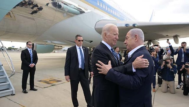 पुढारी ऑनलाईन : इस्रायल-हमास युद्धादरम्यान आज अमेरिकेचे राष्टाध्यक्ष जो बायडेन इस्रायलमधील तेल अविव येथे दाखल झाले. बेन गुरियन विमानतळावर इस्रायलचे पंतप्रधान बेंजामिन नेतान्याहू आणि राष्ट्राध्यक्ष इसाक हरझोग यांनी त्यांचे स्वागत केले. यावेळी उभय नेत्यांनी एकमेकांची गळाभेट घेतली. जो बायडेन यांच्या इस्रायलच्या दौऱ्याच्या पार्श्वभूमीवर कडक सुरक्षा व्यवस्था तैनात करण्यात आली आहे.