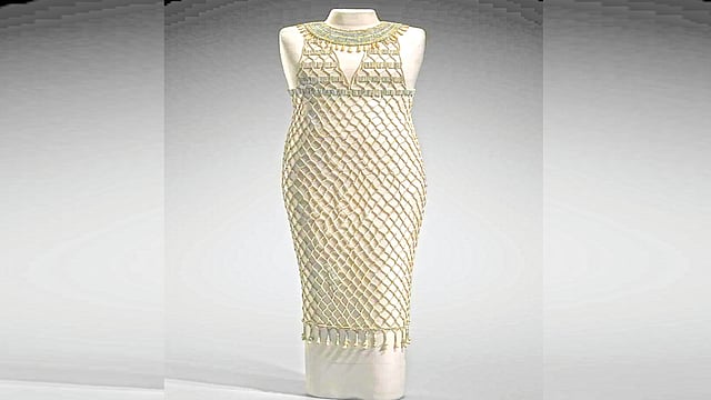 फायन्स म्हणजे बारीक कुटलेल्या क्वार्ट्जपासून बनवलेले झिलईदार कुंभारकाम होय. हे मणी भाजण्यापूर्वी फायन्सच्या मिश्रणात तांबे मिसळले गेले होते, ज्यामुळे त्यांना गडद निळा आणि हिरवट-निळा रंग प्राप्त झाला. हा रंग मुद्दाम ‘लॅपिस लाझुली’ आणि ‘फिरोजा’ यांसारख्या अत्यंत महागड्या रत्नांसारखा दिसावा यासाठी देण्यात आला होता. हा गुडघ्यापर्यंत लांब असलेला पोशाख विणकामाच्या जाळीसारखा दिसतो. यावर हिर्याच्या आकाराची नक्षी आहे. कमरेच्या वरच्या भागावर उभ्या मण्यांच्या ओळींची आकर्षक विणकाम आहे.
