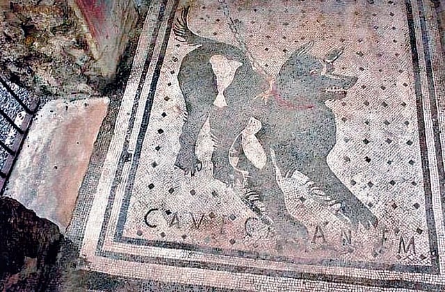 1824 मध्ये संशोधकांनी पॉम्पेईमधील एका घराचे उत्खनन केले असता, प्रवेशद्वाराच्या जमिनीवर एक सुंदर मोझॅक (दगडी नक्षीकाम) सापडले. यात साखळदंडाने बांधलेला, टोकदार गळपट्टा घातलेला एक काळा रागीट कुत्रा दाखवण्यात आला होता. या कुत्र्याच्या पायांच्या मध्ये लॅटिन भाषेत ‘केव कॅनेम’ असे लिहिले होते, ज्याचा अर्थ होतो ‘कुत्र्यापासून सावध राहा.’
