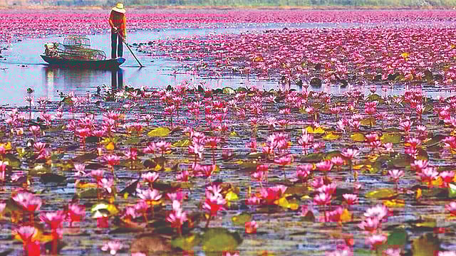 उदोन थानी : थायलंडमधील ‘इझान’ (ईशान्य) प्रदेशातील उदोन थानी प्रांताजवळ असलेले ‘नोंग हान कुमफावापी’ हे सरोवर लाखो कमळांमुळे पर्यटकांचे मुख्य आकर्षण ठरते. स्थानिक भाषेत याला ‘ताले बुआ दाएंग’ म्हणजेच ‘लाल कमळांचा समुद्र’ म्हटले जाते. मात्र, यातील कमळे प्रत्यक्षात चमकदार गुलाबी रंगाची असल्यामुळे हे द़ृश्य एखाद्या जादुई गुलाबी समुद्रासारखे भासते. थाई भाषेत ‘बुआ दाएंग’ म्हणजे ‘लाल कमळ’ असले, तरी प्रत्यक्षात ही फुले गुलाबी रंगाची जलकुंभी (ट्रॉपिकल वॉटर लीली) आहेत.
