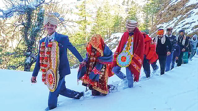 मंडी जिल्ह्यातील केओली पंचायतीच्या बुनालीधार गावातील गितेश ठाकूर आणि भैंचडी गावातील उषा ठाकूर यांचा विवाह 24 जानेवारी रोजी निश्चित झाला होता. मात्र, लग्नाच्या आदल्या दिवशी म्हणजे 23 जानेवारीला भागात प्रचंड हिमवृष्टी झाली. दोन्ही गावांमध्ये सुमारे 3 ते 4 फूट बर्फ साचला, रस्ते बंद झाले आणि चालण्याचे मार्गही बर्फाच्या जाड थराखाली गाडले गेले. स्थानिक रीतीरिवाजांनुसार ठरलेली लग्नाची तिथी बदलणे अशुभ मानले जाते. हीच परंपरा जपण्यासाठी नवरदेव गितेश आणि वऱ्हाडी डगमगले नाहीत. नवरदेव आणि वऱ्हाडी बुनालीधार गावातून पायी निघाले. गुडघाभर बर्फातून वाट काढत त्यांनी 7 किलोमीटरचे अंतर पार केले. हा प्रवास पूर्ण करण्यासाठी त्यांना सुमारे 3 ते 4 तास लागले. लग्न लागल्यानंतर नवरीला सासरी नेण्याचे मोठे आव्हान होते.