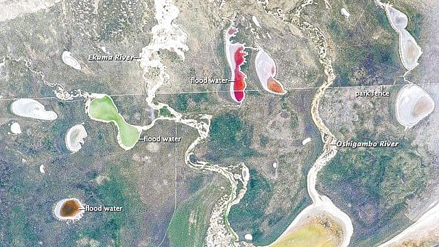 या तलावांचे वैशिष्ट्य म्हणजे त्यांचे गडद हिरवे, लाल, पिवळे आणि गुलाबी असे वैविध्यपूर्ण रंग. शास्त्रज्ञांच्या मते, हे रंग कोणत्याही खनिजांमुळे नसून पाण्यातील विशिष्ट प्रकारच्या शेवाळांमुळे तयार झाले आहेत. जेव्हा या क्षारयुक्त पाण्यात पावसाचे पाणी साचते, तेव्हा त्यातील सूक्ष्मजीव आणि शेवाळ वेगाने वाढू लागतात. हे शेवाळ सूर्यप्रकाशाचे ऊर्जेत रूपांतर करताना विशिष्ट रंगद्रव्ये तयार करतात, ज्यामुळे संपूर्ण तलावाला इंद्रधनुष्यी स्वरूप प्राप्त होते. यातील हिरवा तलाव सुमारे 6.5 किलोमीटर लांब असून, अंतराळातूनही स्पष्टपणे दिसून येतो. हा परिसर अतिशय उष्ण आणि कोरडा असला, तरी या तलावांच्या निर्मितीमुळे स्थानिक परिसंस्थेला नवसंजीवनी मिळते. ‘इटोशा नॅशनल पार्क’ हे सिंह, जिराफ, झेबा आणि हत्ती यांसारख्या प्राण्यांचे निवासस्थान आहे. विशेषतः जेव्हा या भागात पाणी साचते, तेव्हा हजारो फ्लेमिंगो (रोहित पक्षी) येथे प्रजननासाठी स्थलांतर करतात. स्थलांतरित पक्ष्यांसाठी हे तात्पुरते तलाव म्हणजे प्रवासादरम्यान अन्नाचा आणि पाण्याचा एक महत्त्वाचा स्रोत ठरतात.