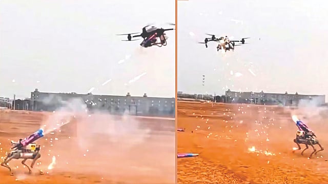 बीजिंग : एक चित्तथरारक व्हिडिओ सध्या सोशल मीडियावर चर्चेचा विषय बनला आहे, ज्यामध्ये एका रोबोटिक कुत्र्याने आणि ड्रोनने एकमेकांवर फटाके डागून जोरदार लढत दिली. या द़ृश्याने भविष्यातील युद्ध संघर्षाचा अंदाज लावता येऊ शकतो. अर्थात, प्रत्यक्ष अशा लढती काही दशके दूर असल्याचे तज्ज्ञांनी म्हटले आहे.