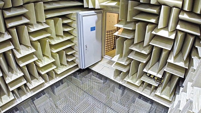 अॅनेकोइक चेंबरची निर्मिती ही ध्वनीची अचूक चाचणी करण्यासाठी करण्यात आलेली आहे. या रुमच्या भिंती, छत आणि फरशीमध्ये कोणत्याही आवाजाला प्रतिध्वनी देण्याची क्षमता नाही. मायक्रोफोन, स्पीकर्स, मोबाईल फोन, लॅपटॉप आणि कीबोर्ड यांसारख्या इलेक्ट्रॉनिक उपकरणांच्या आवाजाची चाचणी करण्यासाठी याचा वापर केला जातो. ही रूम तयार करण्यासाठी जाड स्टीलच्या भिंती, जाड काँक्रीट आणि विशेष फायबरग्लास कोटिंग वापरण्यात आली आहे. यामुळे या रूमच्या भिंती ध्वनी शोषून घेतात, म्हणजेच कोणताही आवाज भिंतीवरून आदळून परत येत नाही.