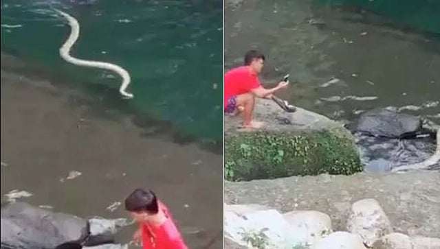 या व्हिडीओमध्ये काही लोक नदीकाठी अंघोळ करताना दिसत आहेत. तर एक तरूण मुलगा सेल्फी घेताना दिसत आहे. अन् त्यातच एक मोठा विषारी साप समोर आला. सापाला पाहिल्यानंतर सेल्फी घेत असलेला मुलगा पटकन पाण्याबाहेर आला. पण, तरीही सापाने त्याचा पाठलाग करणे सोडले नाही. शेवटी सेल्फी घेत असलेला मुलगा मोठा दगडाजवळ आला आणि त्याने या सापाचा व्हिडीओ काढला.
