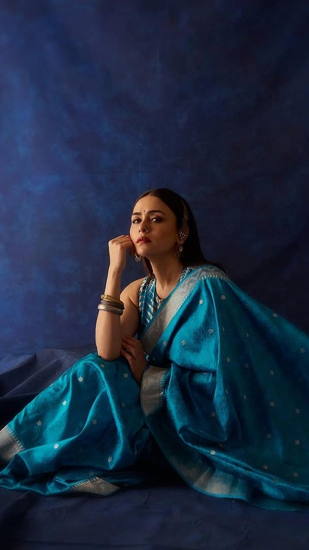 साडीवर असलेली light white bottom आणि silver border तिच्या सौंदर्याला अधिक खुलवत आहे.