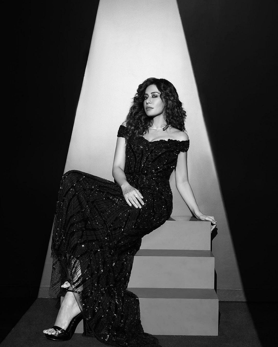 फोटोमध्ये चित्रांगदाने काळ्या रंगाचा नेटेड गिल्ट गाउन वनपीस परिधान केला आहे.