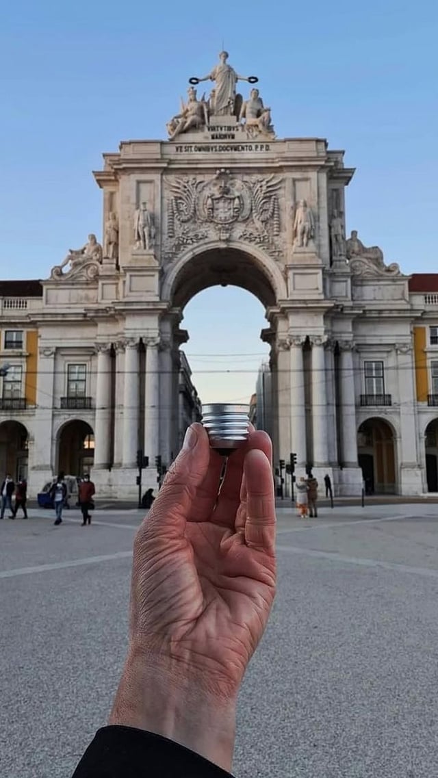 मोठ्या इमारतीच्या छतासमोर छत्री दांडा असा पकडला आहे की तो डोमच छत्री वाटते
