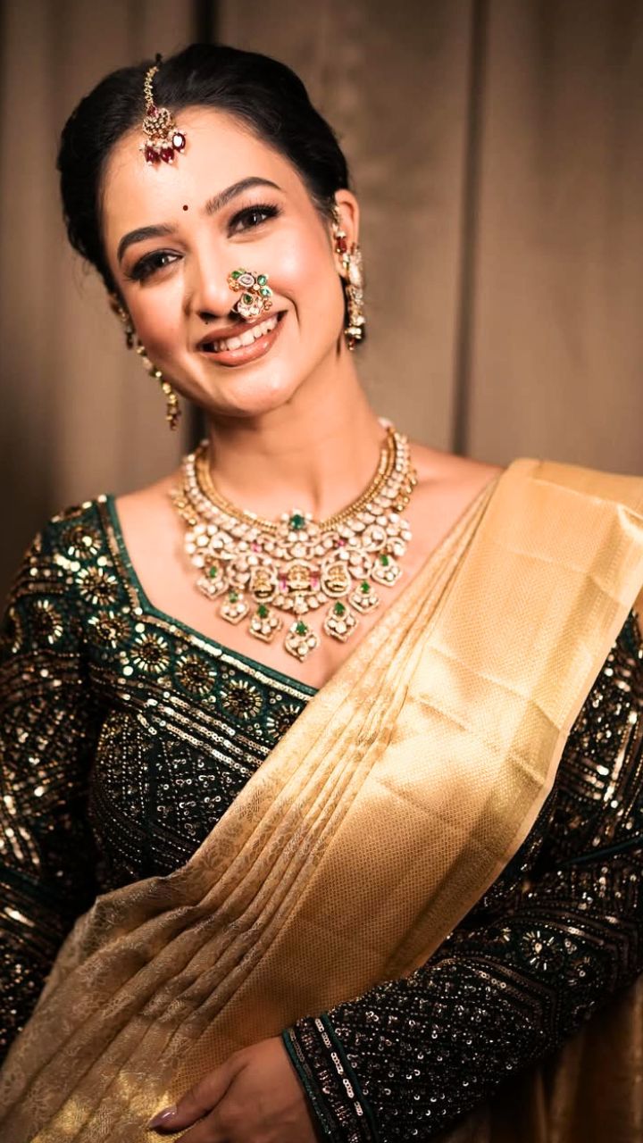 भरजरी ब्लाऊज अन गोल्डन साडीत पारंपरिक लूक लक्षवेधी ठरतेय
