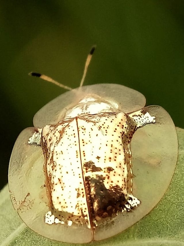 हा किटक प्रथम पाहिला की वाटते एखादा सोन्याचे लॉकेट किंवा तुकडा पडला आहे का, पण हालचाल केल्यावर जाणवते की एक किटक आहे याला गोल्डन टॉर्टोइज बीटल (Golden Tortoise Beetle) असे म्हणतात