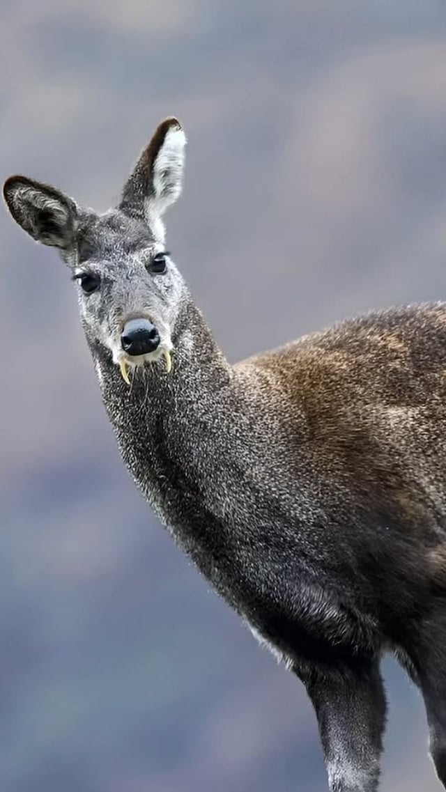 कस्तुरी मृग हा अतिशय लाजाळू आणि दुर्मिळ प्राणी असून त्याला शिंगे नसतात, मात्र बाहेर दिसणारे लांब सुळे (Canines) हे त्याचे वैशिष्ट्य आहे.