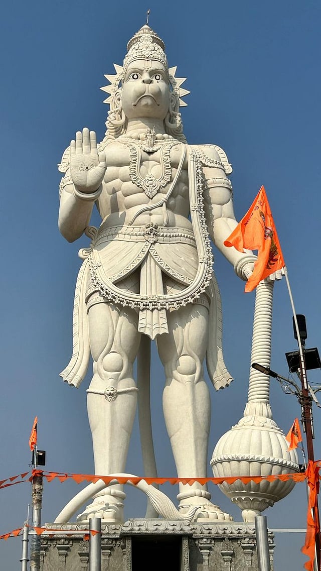 गुजरातच्या सारंगपूरमधील कष्टभंजन हनुमान मंदिराबाहेरील भव्य मूर्तीसमोर भाविक नतमस्तक होतात.