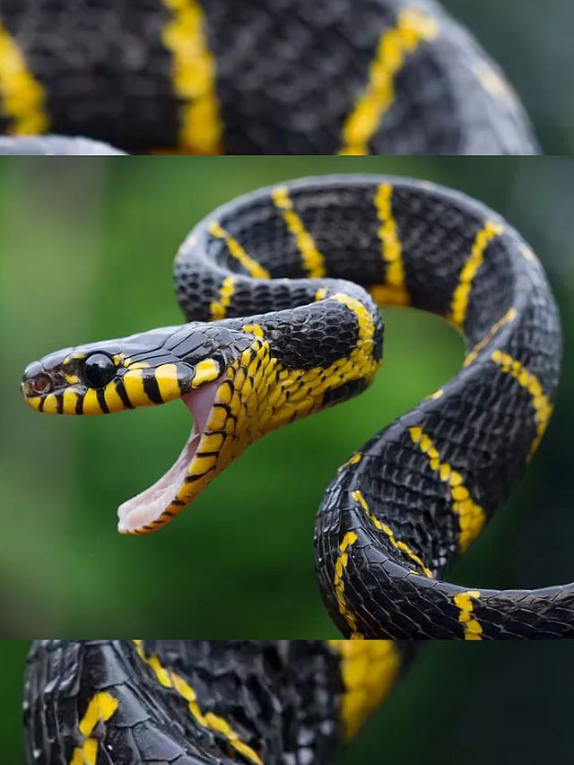 हा साप गडद काळ्या रंगाचा असतो आणि त्याच्या संपूर्ण अंगावर गडद पिवळ्या रंगाचे उभे पट्टे किंवा रिंग्ज असतात. हे पट्टे पोटाच्या बाजूने अधिक स्पष्ट दिसतात