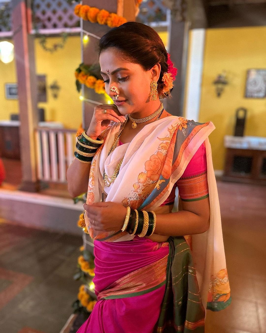 तिने कानात नथ, हातात चुडा, केसात गुलाबाचे फुल घालून मराठमोळा साज पूर्ण केला