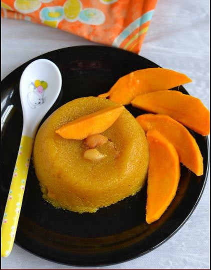 हापूस आंबा, १ कप रवा, ४ चमचा तेल, मीठ, अर्धा कप साखर, अर्धा कप दुध, बेकिंग पावडर, बेकिंग सोडा व्हॅनिला इसेन्स इ. साहित्य वापरून मॅगो केक बनवा.