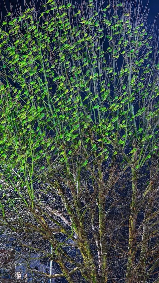 पण रात्रीच्यावेळी ही चमकनारी पाने पाहून झाडाजवळ गेल्यास वेगळीच गोष्ट समोर येते. ही पाने नसून विश्रांती घेत असलेले शेकडो पोपट असतात