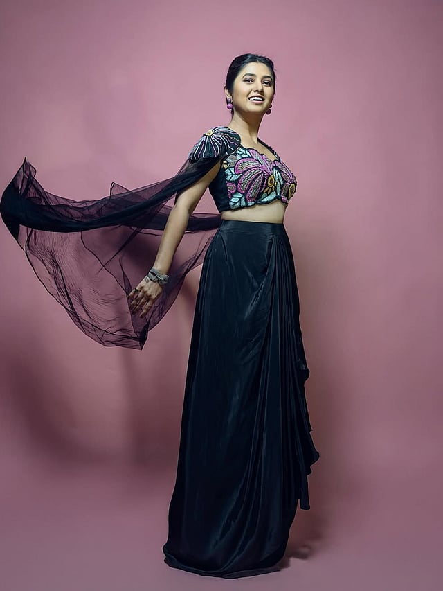 या फोटोमध्ये प्राजक्ताने काळ्या रंगाचा डिझायनर आऊटफिट परिधान केला आहे.