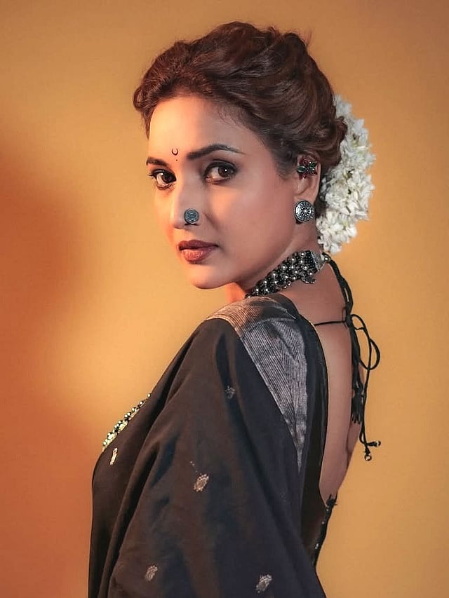 ब्लॅक प्युअर हँडलूम सहावारी पैठणी साडी तिने नेसली आहे