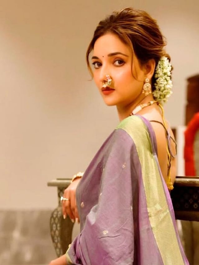 साडीला पारंपरिक दागिने तिने घातले असून नाकात मोहक नथ दिसतेय