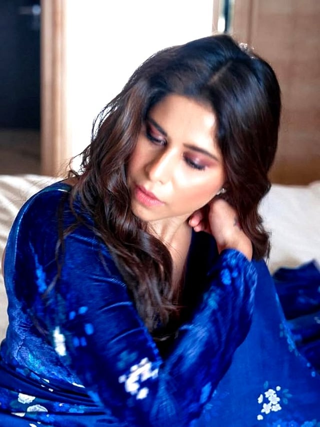 रॉयल ब्ल्यू फ्लोरल प्रिंटेड साडी, मॅचिंग ब्लाऊज, मोहक हास्याने चाहत्यांना भुरळ घातलीय