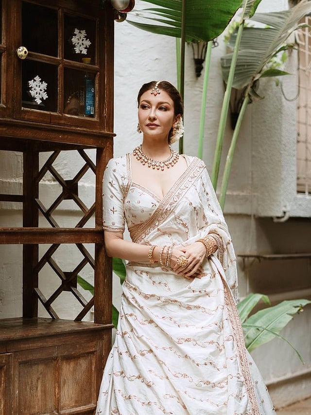 ऑफ व्हाइट लहंगा त्यावर कुंदन ज्वेलरी आणि शुभ्र कळ्यांचा गजरा यामध्ये ती लोभस दिसते आहे