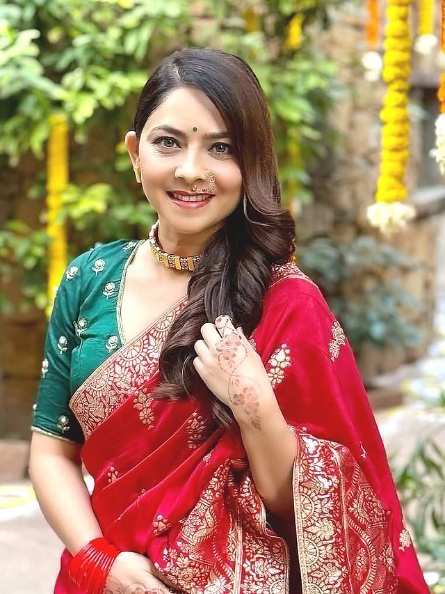 मराठी सिनेसृष्टीची अप्सरा म्हणजे, अभिनेत्री सोनाली कुलकर्णी होय..सोनालीने दर्जेदार मराठी चित्रपटांसोबत अनेक हिंदी चित्रपटात काम केलं आहे..सोनालीने भरजरी डिझाईन असलेली रेड कलरची साडी परिधान केली आहे..मोकळे केस, नाकात नथ, रेड बागड्या, नेकलेस, टिकली, मेकअपने तिने लूक पूर्ण केलाय..रेड साडीवर तिने ग्रीन कलरचे ब्लाऊज घातले आहे. .सोनालीच्या पाठिमागे सजवलेला मंडप आणि झेंडूच्या फुलांच्या माळा परिधान केल्या आहेत..'तुझे टपोरे डोळे...' लग्नानंतर होईलच प्रेम फेम रम्याची अंबरात नाजुकशी चंद्रकोर