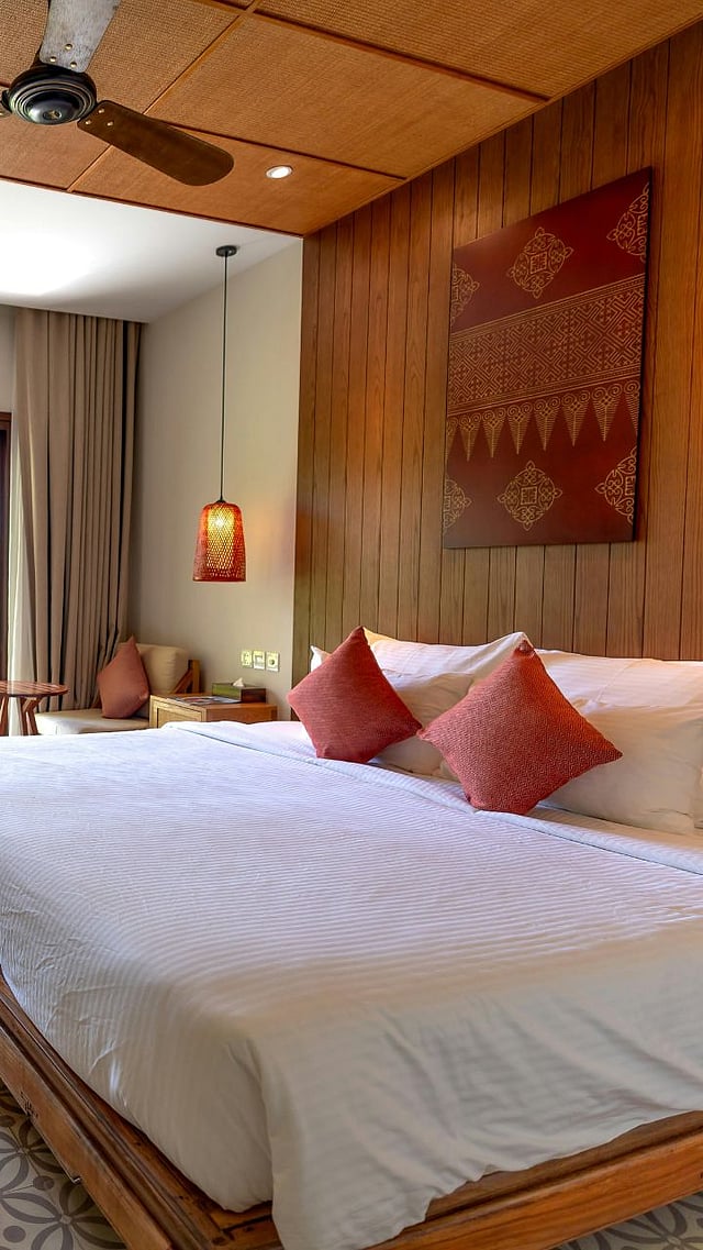 पांढऱ्या चादरी प्रकाश परावर्तित करतात. खोली मोठी, स्वच्छ आणि महागडी वाटते.